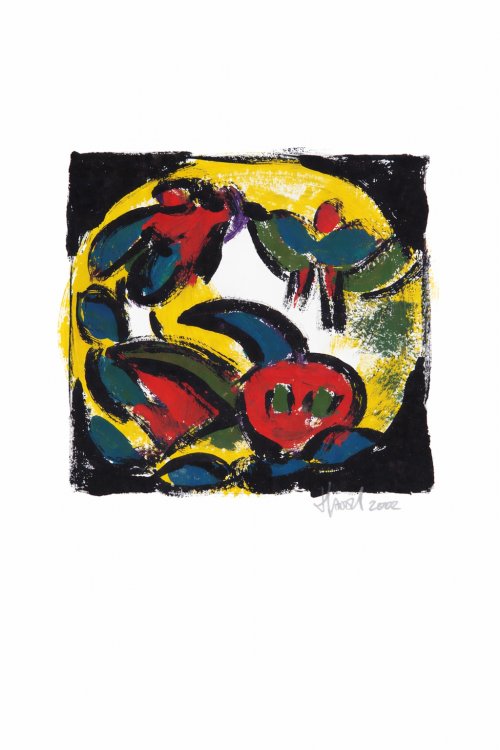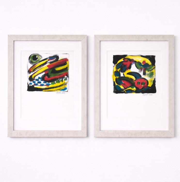 The vivid colors — red, yellow and green — are enhanced by deep black accents, creating a strong visual contrast. At the same time, the presentation with passe-partout and frame adds a refined elegance. A diptych that is modest in size, yet rich in character.