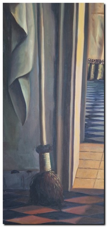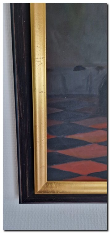 This oil painting on canvas is entirely hand-painted and built up in rich, harmonious layers. The careful rendering of details such as the chair, candlestick, keys and slippers creates a captivating and atmospheric composition.
