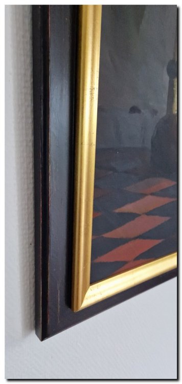 The painting is presented in an elegant classic wooden frame (outer size 80 × 110 cm). The combination of a warm gold inner edge and a darker outer frame enhances the timeless character and complements the atmosphere of Dutch Golden Age paintings.