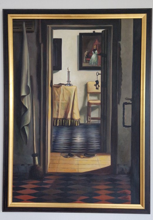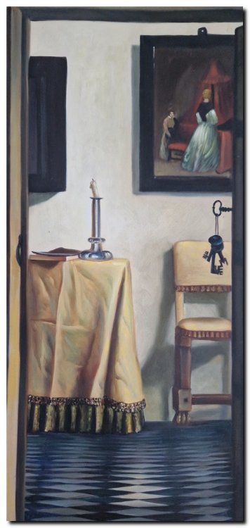 This refined hand-painted reproduction after the work of Samuel Dirksz van Hoogstraten captures the quiet beauty of a 17th-century Dutch interior. Through its masterful use of perspective, light and layered composition, the painting evokes a sense of calm, depth and timeless elegance.