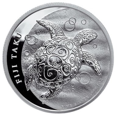 "FIJI TAKU". 2 Dollars 1 oz Silver BU "Turtle" FIJI 2013. Fineness: 999‰ Diam.: 40,70 mm. Weight: 31.103 gr (1 oz). Legal tender.