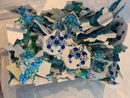 This package contains 15 pieces of already made bling in the color shade blue. They are 15 random bling pieces that I made on double sided medical tape.